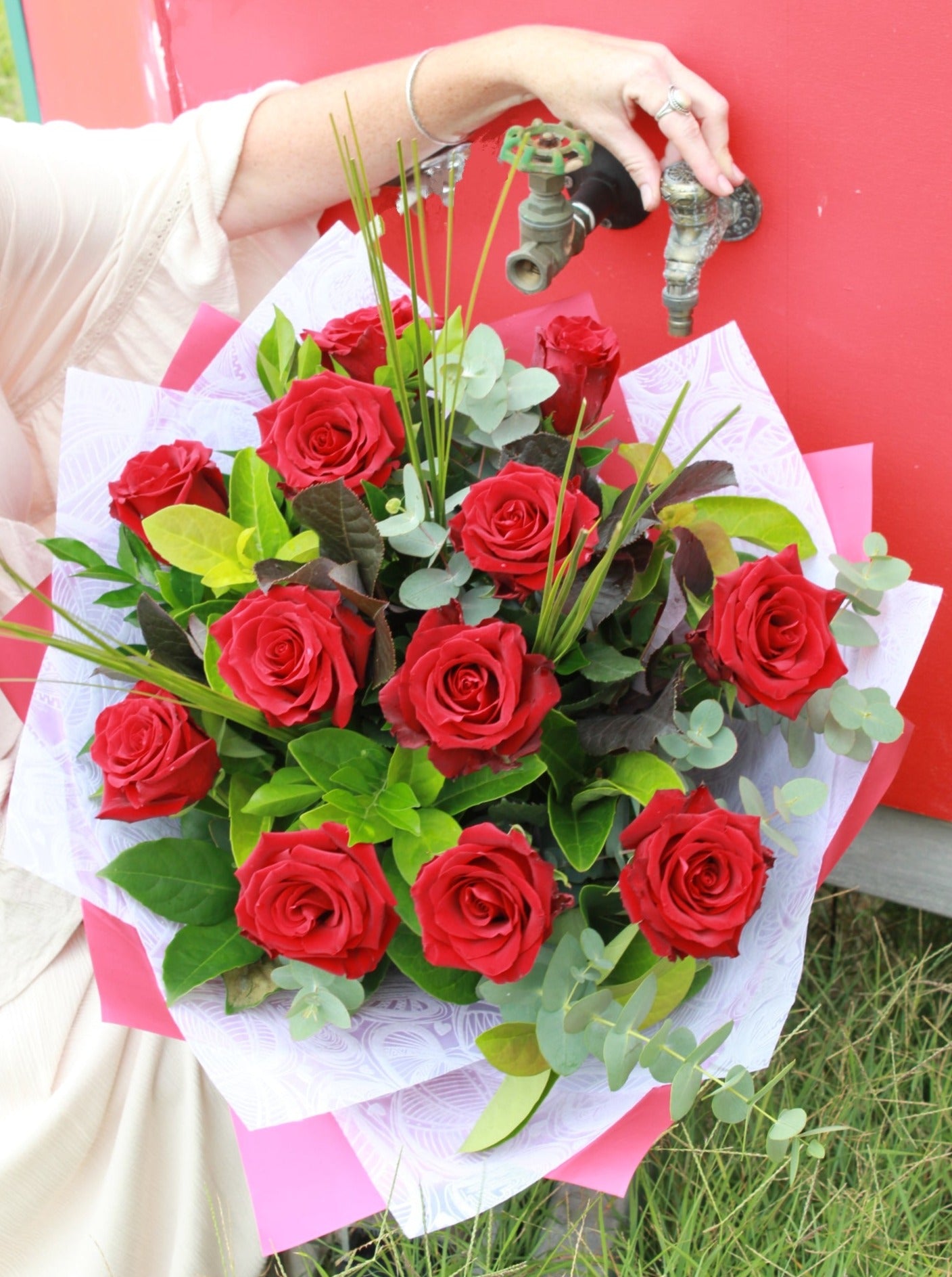 This bouquet features 12 Red Roses, lush and beautiful, a gorgeous statement of Love Baby.