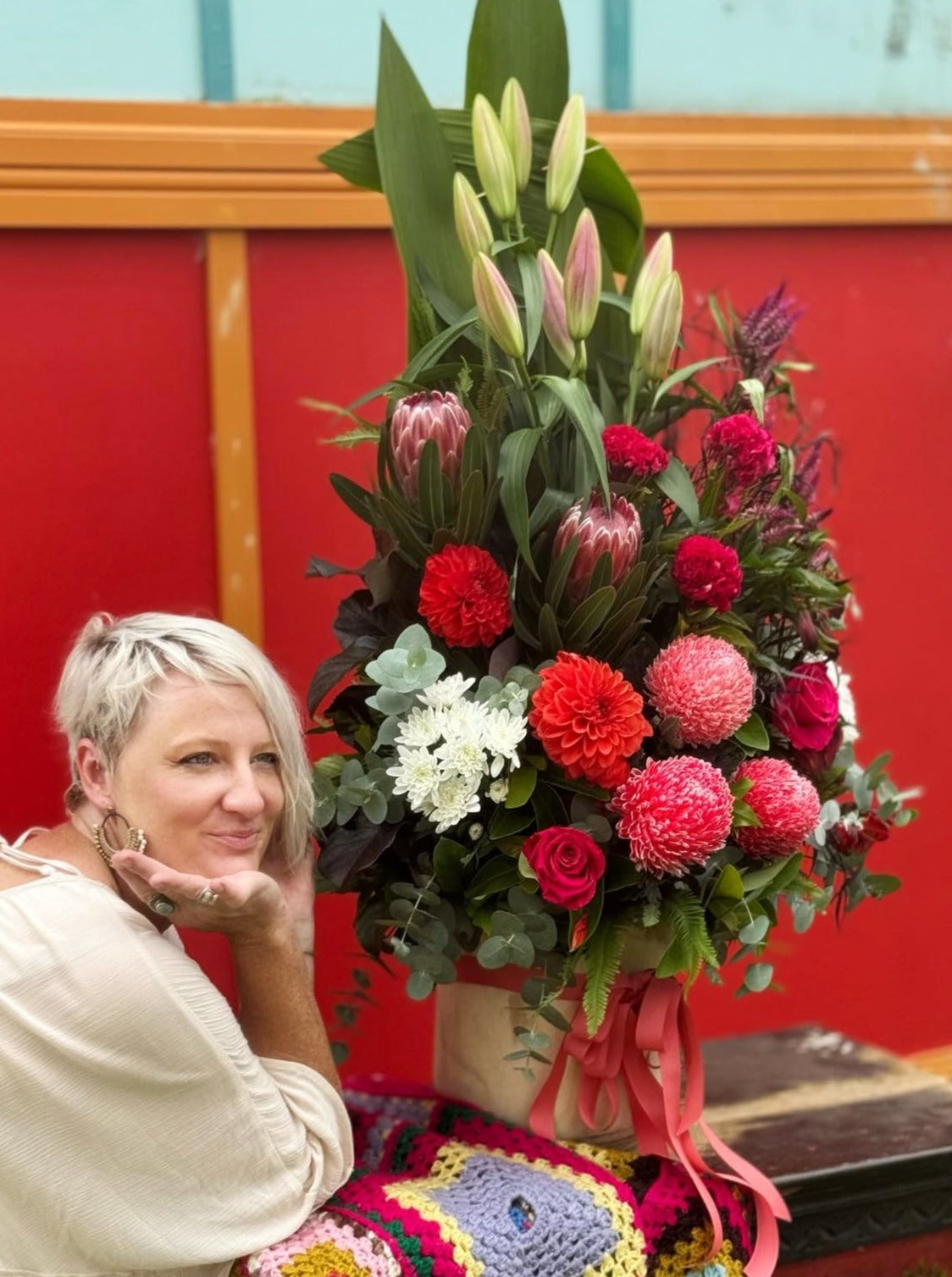 "Make a big statement with My Love, a stunning fresh flower arrangement. Show your love in a unique way!" Please be aware this photo is just an example, this is a florist choice seasonal mix.
