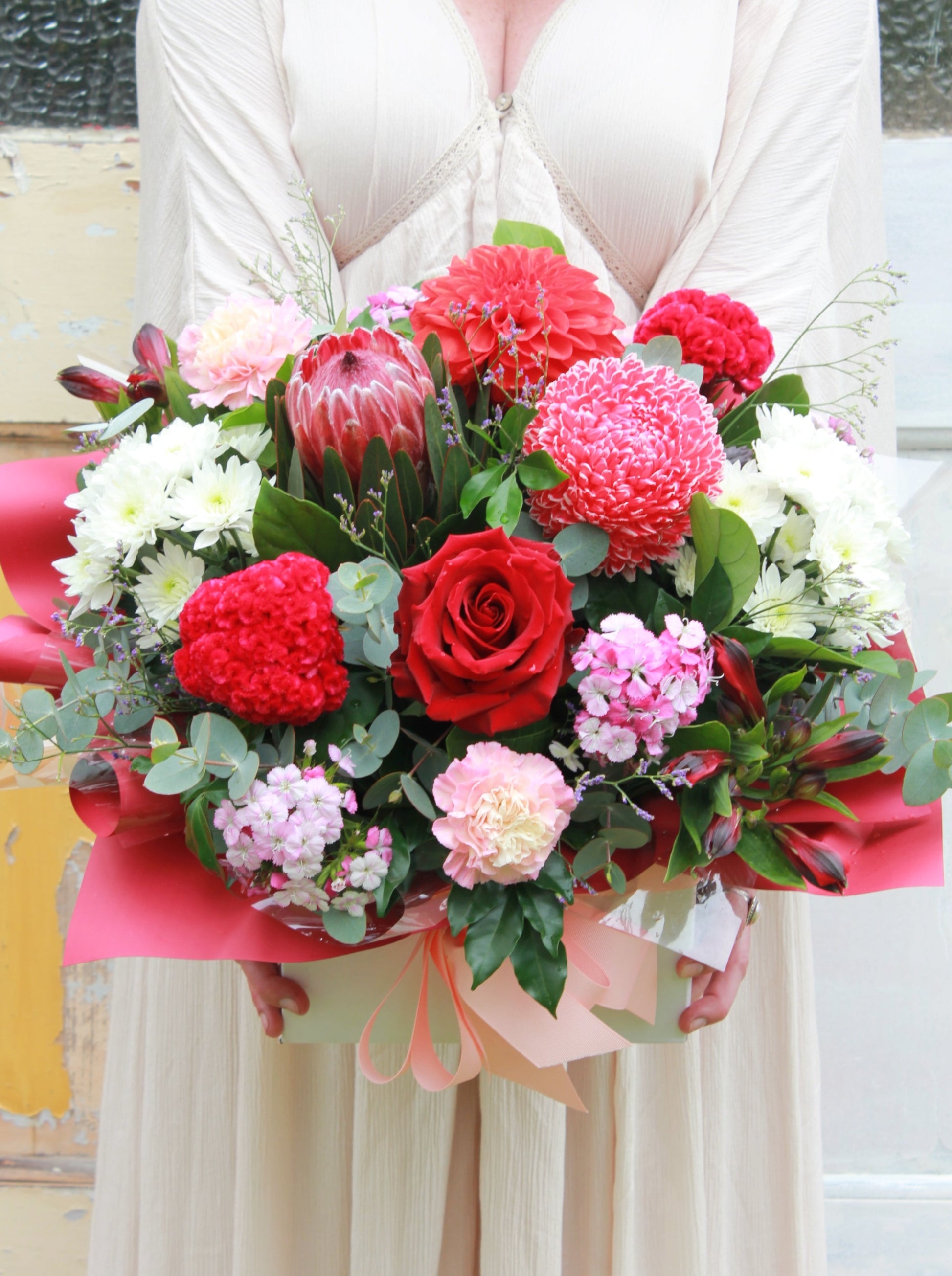 "Spice up your space with Pumkin! This vibrant box arrangement is bursting with fresh blooms and a gorgeous rose, perfect for adding a touch of romance. Please be aware this photo is just an example, this is a florist choice seasonal mix.