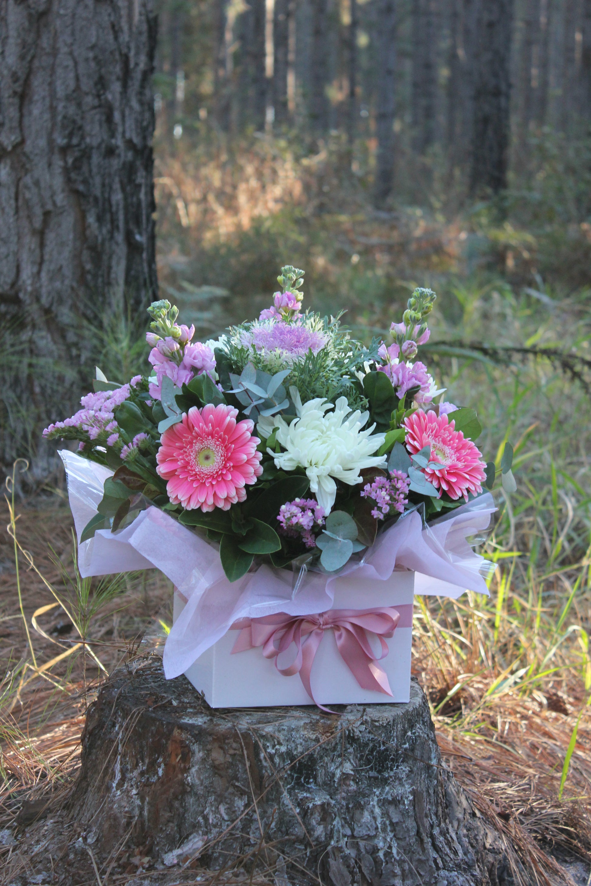 Pictures are examples of seasonal Arrangement, what you receive will be subject to seasonal availability. If you have requests for favourite colours- please let me know in the notes or call & I will endeavour to do my best to accommodate.